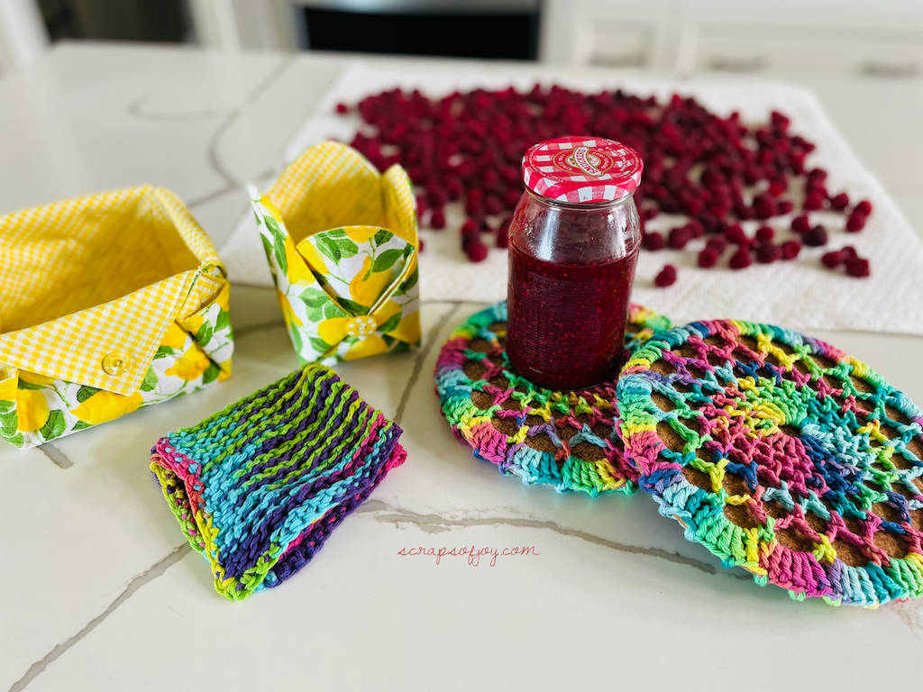 Mom made me something new for every day of my birthday week: quilted fabric baskets in lemony gingham, raspberry jam, crocheted potholders and a dishcloth in rainbow cotton. The amazing thing is that each thing she gave me, she had made that day!