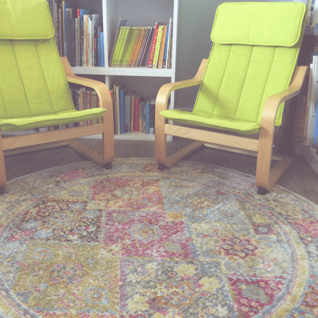 Before my library was even close to being ready, I’d set apart a tiny corner especially for children. Low bookshelves, with only a couple of children’s books at that time, a colourful round carpet, and two kid-sized armchairs, lime green.